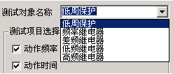 測試對象名稱中包含“低周保護”、“頻率繼電器”、“差頻繼電器”、“低頻繼電器”以及“高頻繼電器”五種繼電器。默認情況下選擇“低周保護”。其下拉菜單如圖所示: